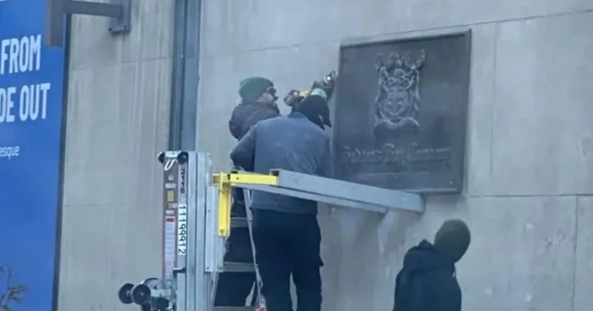 A photo that went viral, shared by Integrity Toronto, a group describing itself as a “coalition of citizens committed to restoring integrity-driven leadership” in the city, shows a group of men drilling out a bronze Hudson’s Bay plaque from a historic building.
