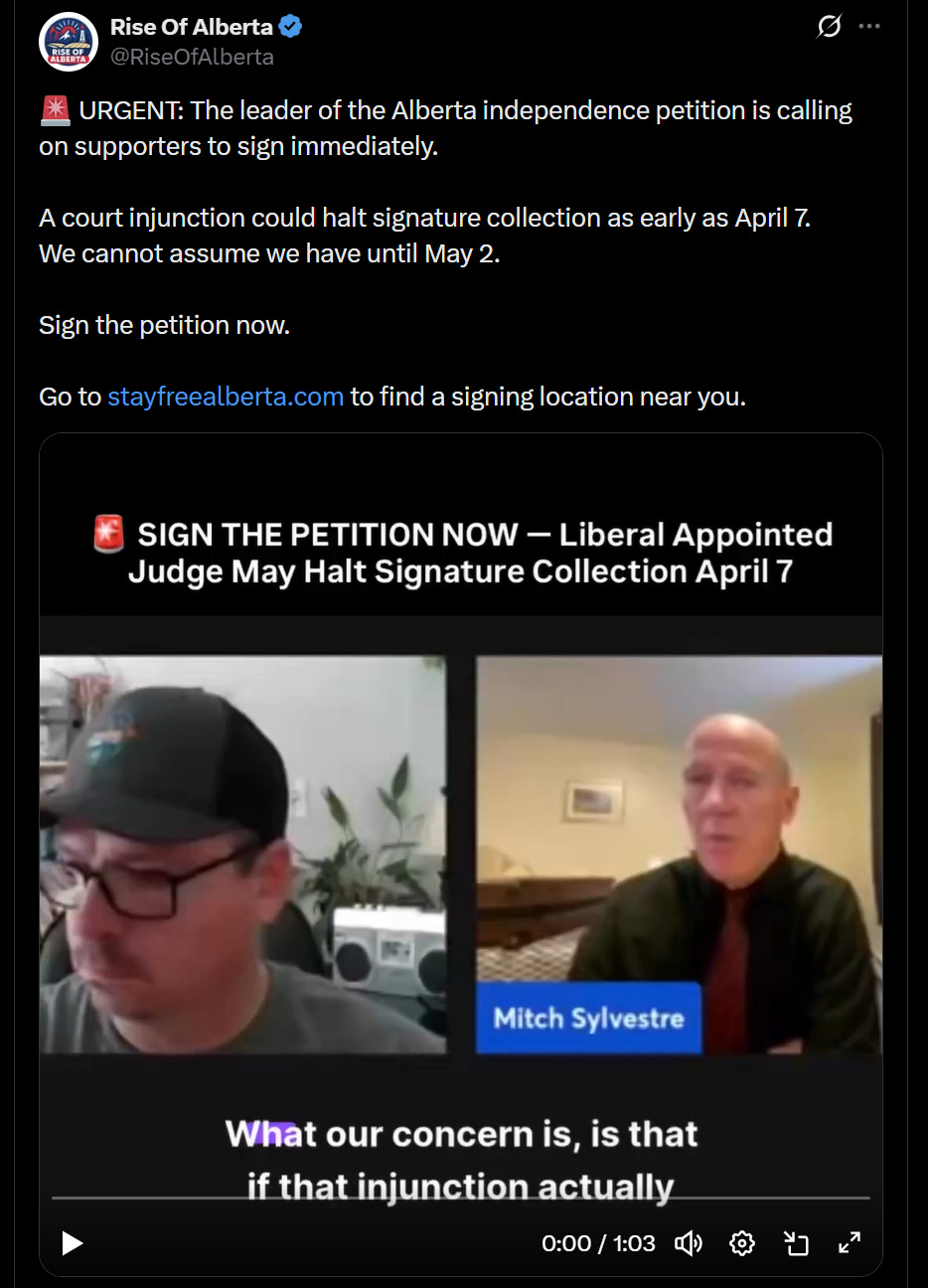 Alberta’s independence movement is racing against a looming court injunction, with organizers demanding immediate signatures before a judge could shut down signature collections next month.