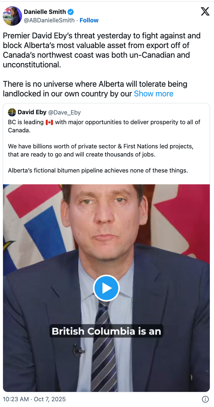 “There is no universe where Alberta will tolerate being landlocked in our own country by our neighbouring province, especially when the same industry he continues to demonize has generated so much wealth for his province and the country,” wrote Smith.
