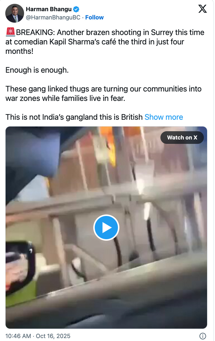 The Surrey Police Service is investigating another shooting at Kap’s Cafe—an upscale coffee house and Indian restaurant owned by Bollywood star Kapil Sharma—after reports of shots being fired at the business on 85 Avenue and 120 Street at around 3:45 a.m. Thursday.
