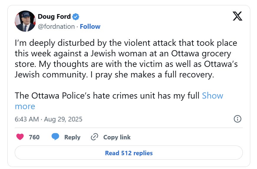 “I’m deeply disturbed by the violent attack that took place this week against a Jewish woman at an Ottawa grocery store. My thoughts are with the victim as well as Ottawa’s Jewish community. I pray she makes a full recovery,” Ford said. “The Ottawa Police’s hate crimes unit has my full support as they carry out their investigation into this attack. Hate, violence and antisemitism have no place in our province.”