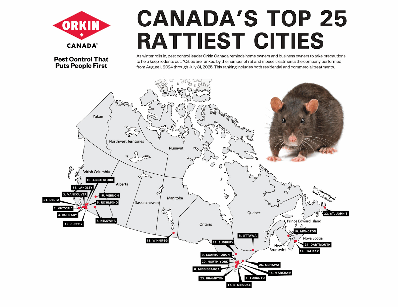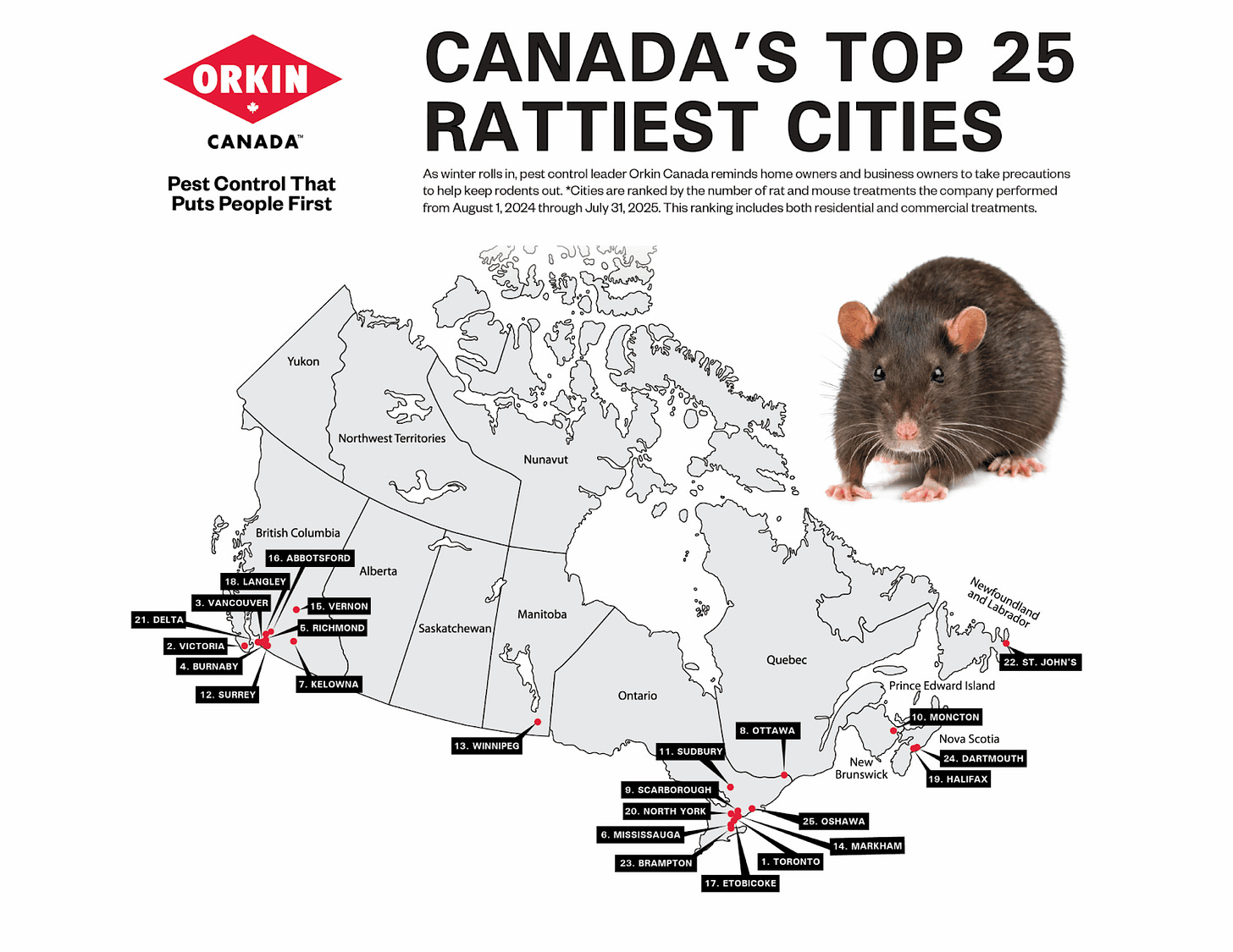 Toronto was named Canada’s “rattiest” city for 2025. The rest of the top-ten list is: Victoria, Vancouver, and Burnaby. Richmond and Mississauga are tied for fifth place. Rounding out the list are Kelowna (sixth), Ottawa (seventh), Scarborough (eighth), and Moncton (ninth).