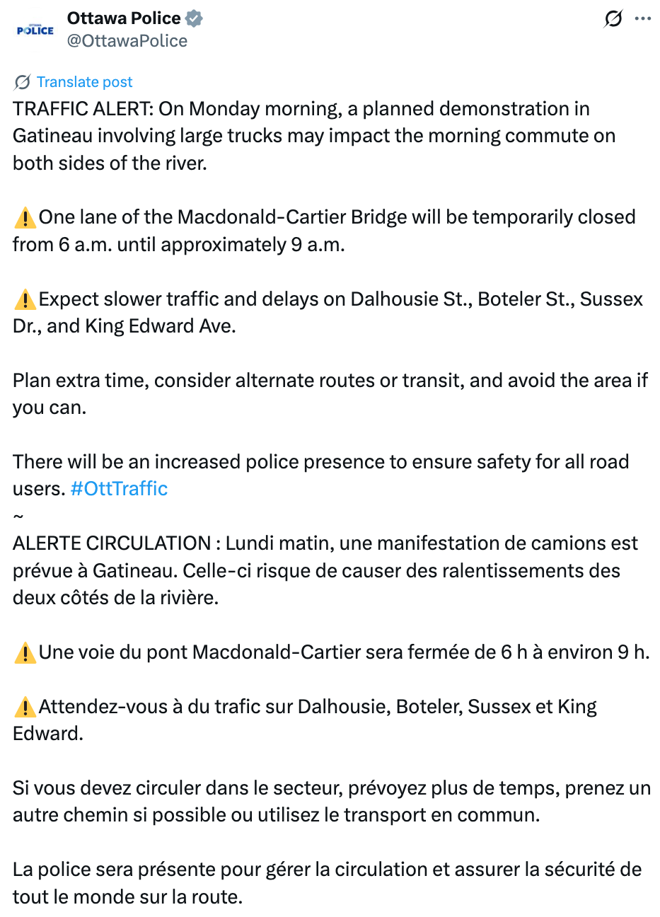 Truckers met in the Montreal area, Quebec City, Trois-Rivières, and Ottawa on Monday. Another gathering planned for Gatineau was cancelled.