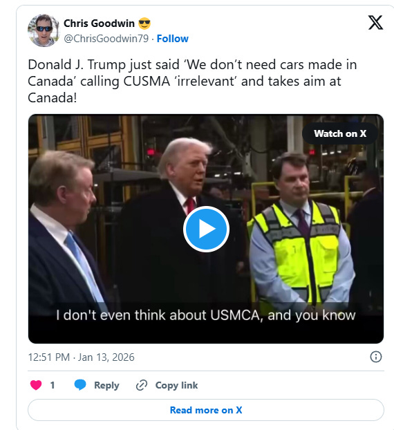 “We don’t need cars made in Canada, we don’t need cars made in Mexico, we want to make them here, and that’s what’s happening. Everybody’s moving here. From Canada, they’re coming here, from Mexico. From Japan, from Germany, from all over the world,d they’re coming here. They’re opening plants.”