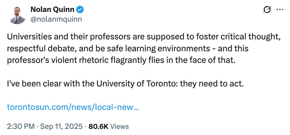 A University of Toronto political science professor has been placed on leave after making a social media post in which she said, “shooting is honestly too good for so many of you fascist c****,” in a reply to a thread discussing American commentator Charlie Kirk’s murder at a Utah university.