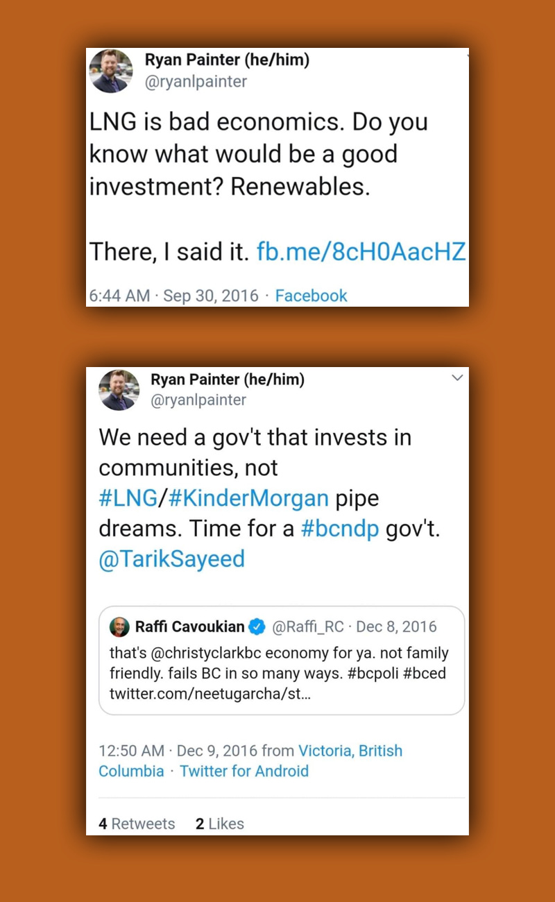 “We need a gov’t that invests in communities, not #LNG/#KinderMorgan pipe dreams. Time for a #bcndp gov’t,” Painter said.