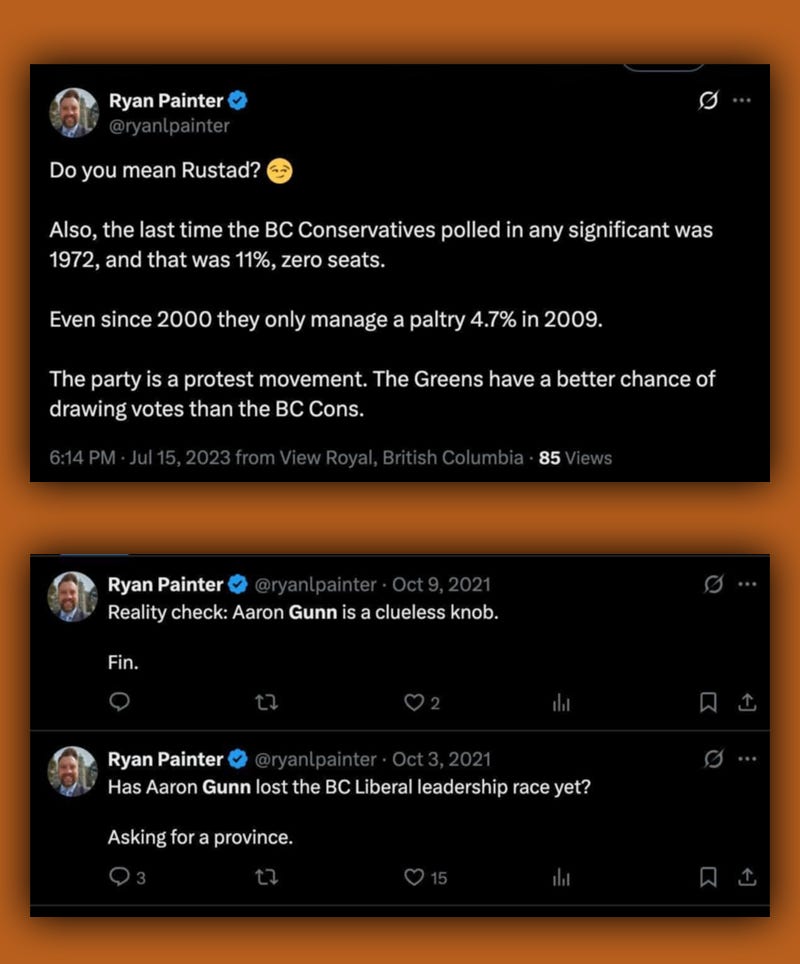 Painter, who currently manages communications for the BC Conservative Caucus, previously described himself as an “NDP lifer” and posted comments directed at BC Conservative leader John Rustad, while also calling Conservative MP Aaron Gunn a “clueless knob.”