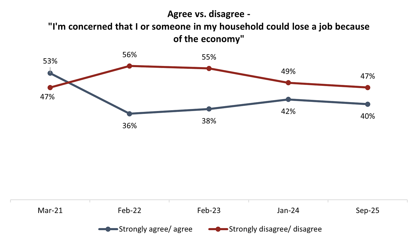 Two-in-five Canadians are concerned they or someone in their household may lose a job due to the current economy. This is an increase from 2022 and 2023 data, but 13 points lower than the proportion in March 2021.