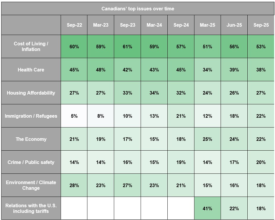 Meanwhile, the proportion of those choosing tariffs and U.S. relations as a top issue facing Canada has dropped dramatically from 41 to 18 per cent, while cost of living topped the priority list at 53 per cent.