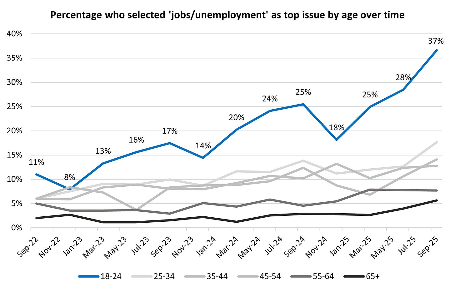 “Approaching two-in-five (37 per cent) 18- to 24-year-olds choose jobs and unemployment as a top issue facing the country. That’s double the proportion who said the same last December (18 per cent) and up nine points since June (28 per cent).”