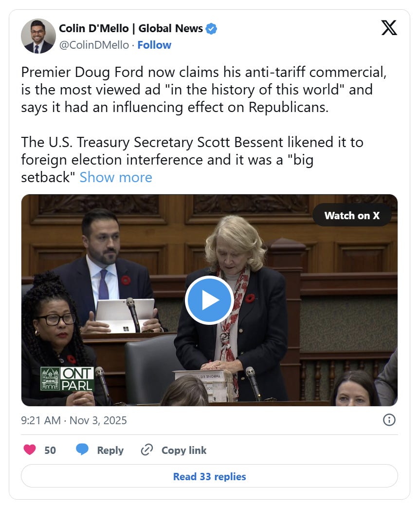 U.S. Treasury Secretary Scott Bessent compared Ontario Premier Doug Ford’s anti-tariff Reagan-era ad to “election interference,” calling it a form of “propaganda” aimed at Americans.