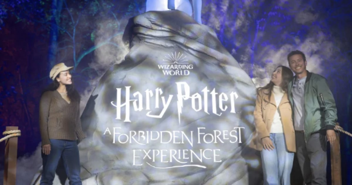 The immersive event, created by Warner Bros. Discovery Global Themed Entertainment, allows visitors to walk through a light-filled “forbidden forest” inspired by the Harry Potter series. Tickets start at about $50 for children and climb to more than $80 for adults.
