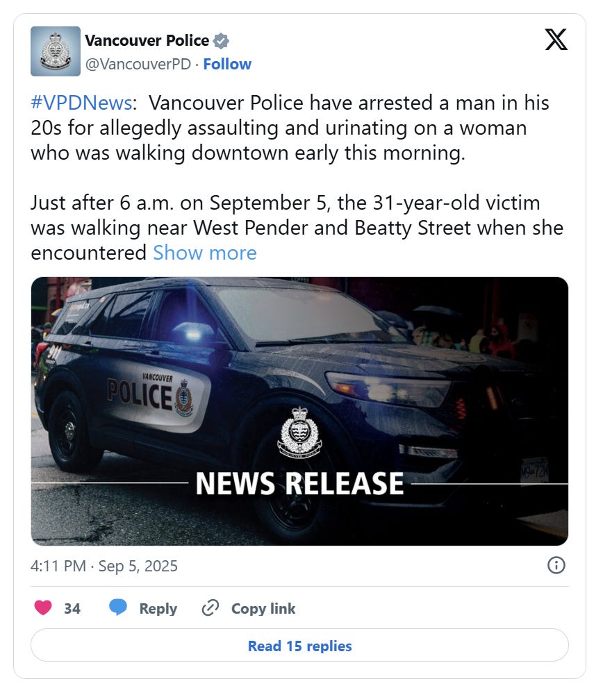 According to a Friday post on X from the Vancouver Police Department, just after 6 a.m. on September 5—when many Vancouverites are on their way to work—a 31-year-old victim was walking near West Pender and Beatty Street when she encountered a naked man on top of a parked car.