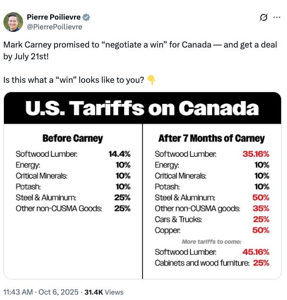 But have Canadians seen any positive results? Trump has in fact ADDED tariffs to Canada since Carney’s election.