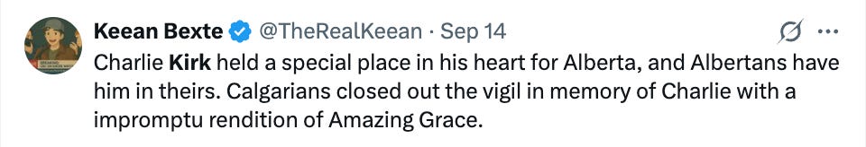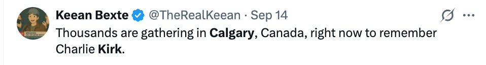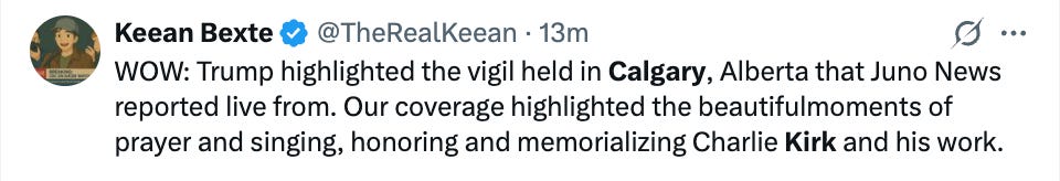 At Sunday's memorial for Charlie Kirk in Arizona, US President Donald Trump specifically acknowledged the vigil held one week ago in Calgary