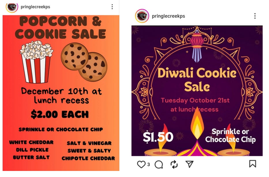 In the previous school year, Pringle Creek posted seven times about Diwali, three times about Lunar New Year, and shared a Grade 1 classroom post celebrating Hanukkah and Kwanzaa as part of “December celebrations,” again without mentioning Christmas. Easter, meanwhile, was framed as a spring-themed STEM activity to “Design an Easter basket,” rather than a religious holiday.