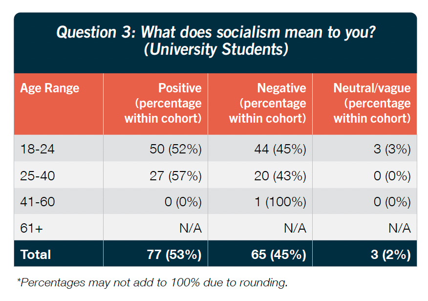 Throughout the survey, attitudes were more negative than positive towards socialism. However, there was still a sizeable minority in favour of socialism and, among university students, a slim majority in favour of socialism.